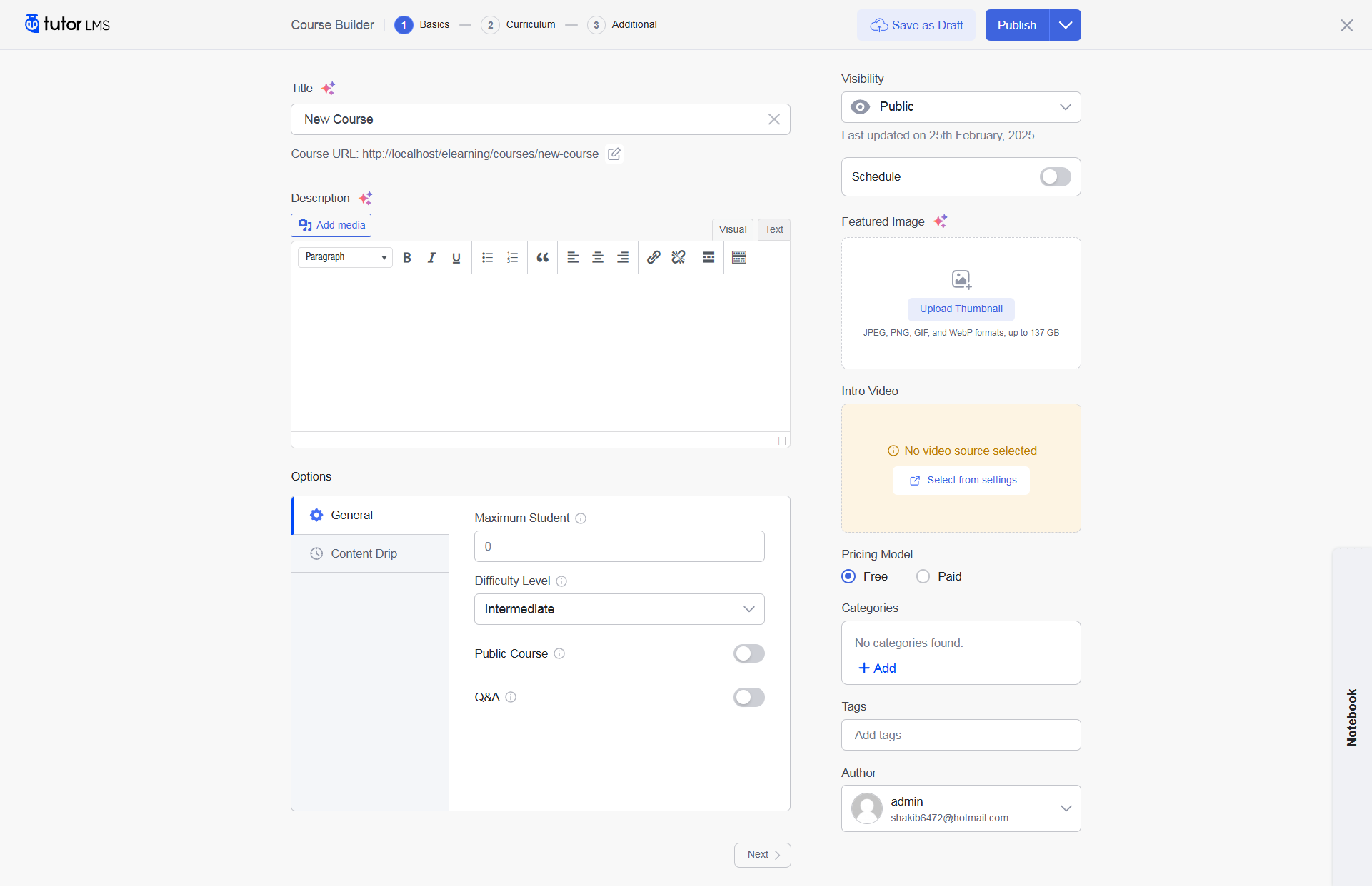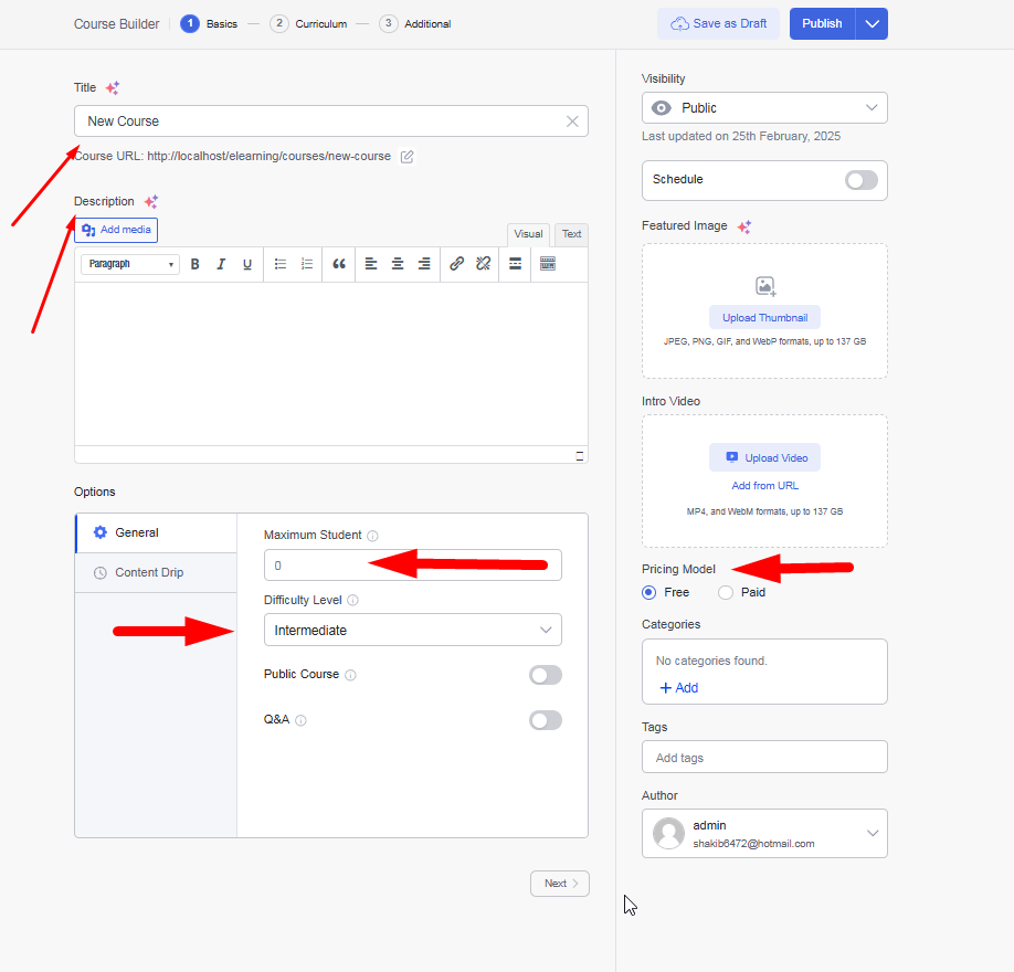 Define the course difficulty level (Beginner, Intermediate, Advanced). > Set the maximum number of students allowed.