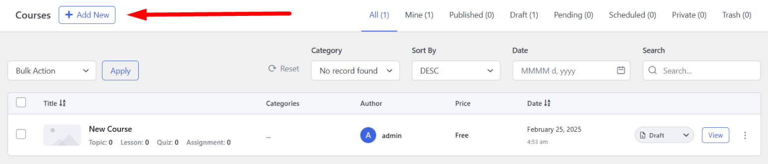 From the dashboard, go to TutorLMS > Courses. Click on Add New to start a new course.