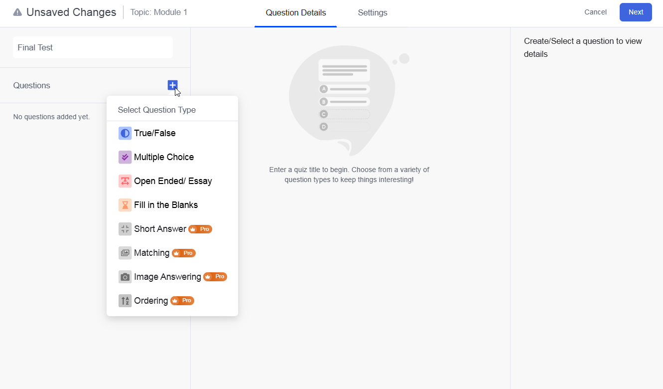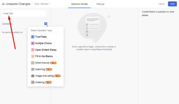 Click on Add Question to input questions. > Choose from various types: multiple-choice, true/false, matching, etc. > Provide correct answers and, if necessary, explanations.