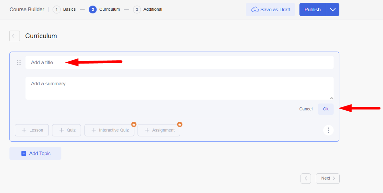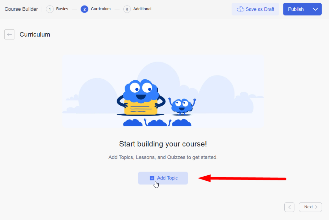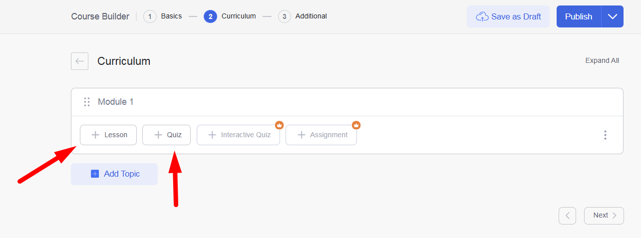 Add Topics and Lessons: Click on Add New Topic to create a module or section.