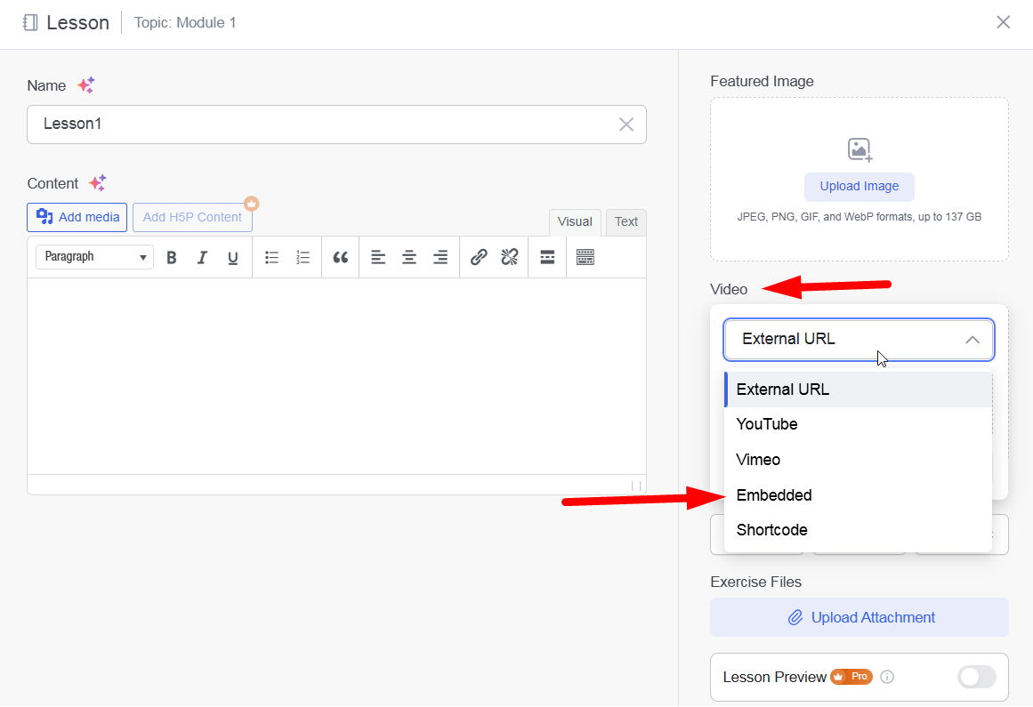 Edit Lesson Details: Click on a lesson title to open the lesson editor > Add content using the text editor, including text, images, and other media.