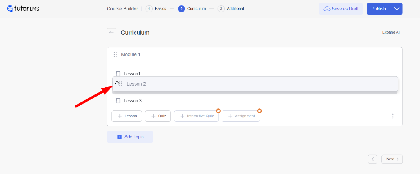 Drag and drop topics and lessons to arrange them in your desired order.