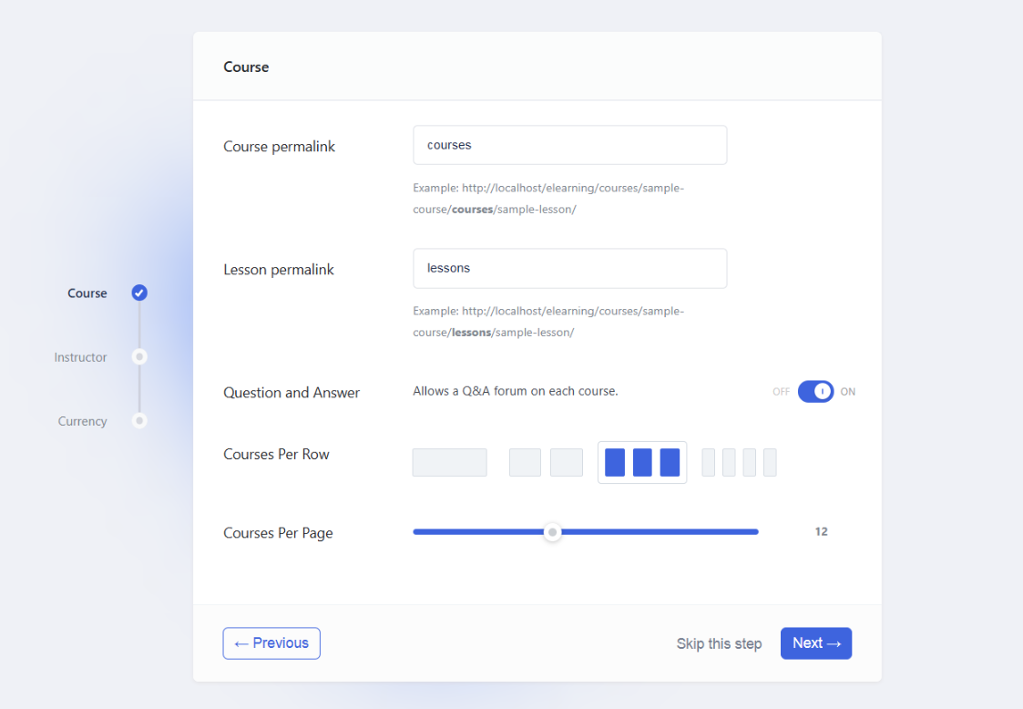 Upon activation, a setup wizard will guide you through initial configurations. Follow the prompts to set up essential settings like currency, course permalinks, and instructor roles.